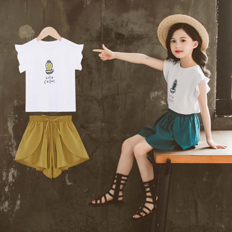 子供服 子ども服 女の子 セットアップ 夏 夏服 カジュアル ナチュラル 半袖 Tシャツ ショートパンツ 無地 個性的 カクタス柄 ジュニア 2colors 可愛い かわいい 普段着 日常