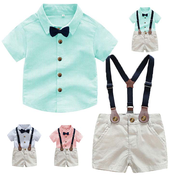 ベビー服 新生児 男の子 70 80 夏 夏服 半袖 シャツ ストライプ柄 サスペンダーパンツ 綿 3色選べる ブルー ピンク グリーン 幼児 乳児 赤ちゃん 通気性