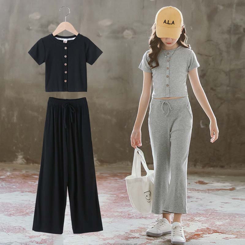 セットアップ レディース ジュニア キッズ カジュアル おしゃれ 半袖 Tシャツ 前ボタン ワイドパンツ ロング丈 キッズダンス衣装 ヒップホップ 衣装 ファッション