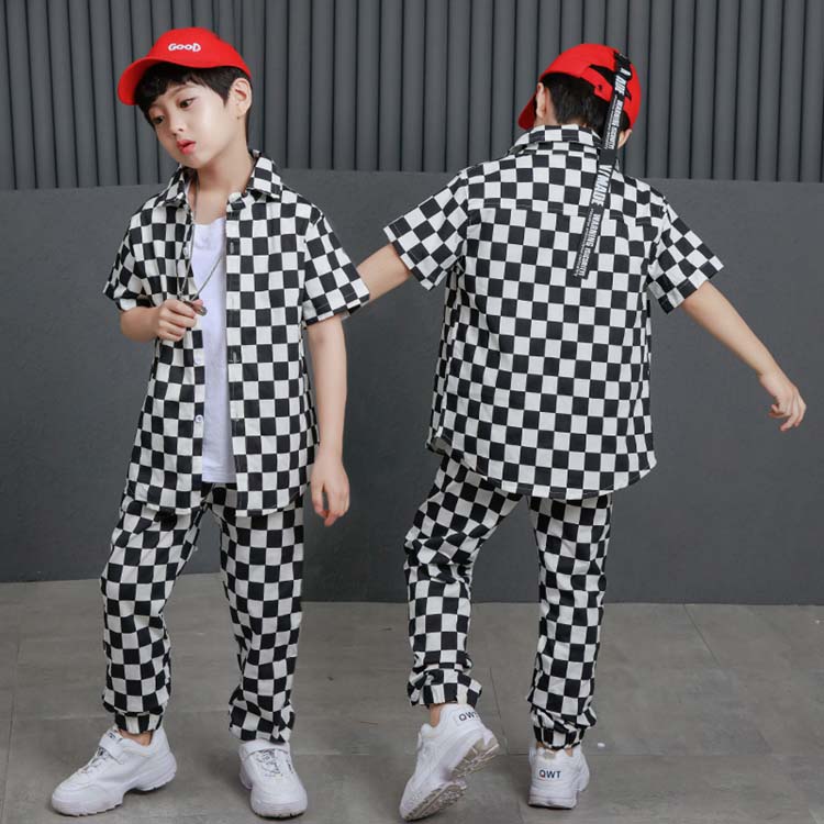 キッズダンス衣装 ダンス衣装 キッズ トップス パンツ 半袖 シャツ ロング丈 パンツ チェック柄 個性的 ヒップホップ 衣装 ファッション 日常 普段着 ダンス レッスン ストリート