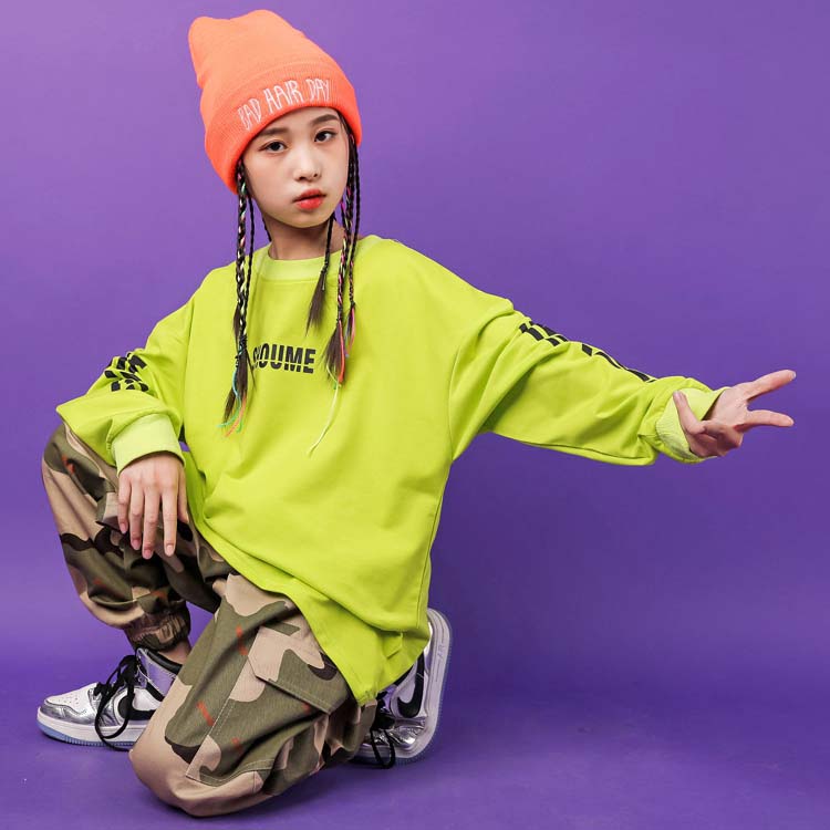 ダンスウェア レディース おしゃれ 子供 ジュニア ダンス衣装 パンツ トップス ダンス 衣装 ヒップホップ 長袖 パーかー へそ出し ロング丈ズボン 迷彩 舞台 演出 練習 カジュアル