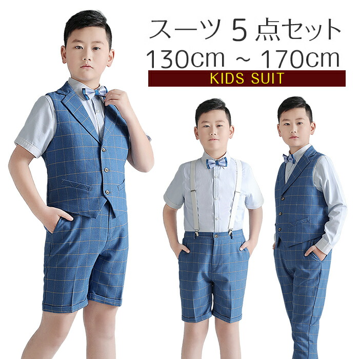 フォマールスーツがお洒落なアンサンブルア キッズスーツ 演奏会 結婚式 卒園式 卒業式 半袖 長袖 可愛い スーツ 成人式 小学生 中学生 高校生 七五三 紺上品 ブルー 男の子 体