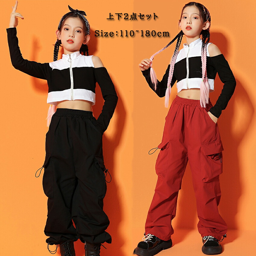子供 女の子ヒップホップ ダンス衣装セットアップ tシャツカーゴパンツ 長袖k-pop 衣装ジャズヒップホップ ダンス衣装キッズ 女の子ダンスtシャツ ボーダー柄