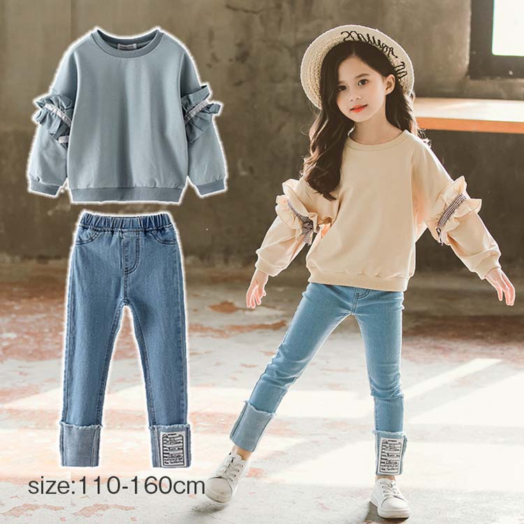 子供服 子ども服 女の子 カジュアル ナチュラル 春秋 長袖 パーカ 袖 フリルデザイン ジーンズ デニム ロング丈 ズボン おしゃれ 可愛い ゆったり 大きいサイズ レディース