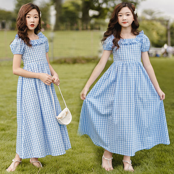 ロング ワンピース キッズ フレアワンピース チェック柄 半袖 子供服 スクエアネック マキシワンピース フリル ロング丈