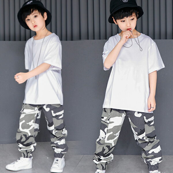 かっこいい迷彩柄ダンス衣装 ベーシックな白シャツ+迷彩柄テーパードパンツ~110から170までご用意男女兼用ダンスウェア~普段着もおすすめ~