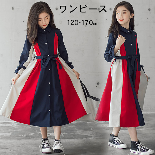 ワンピース キッズ シャツワンピース フレアワンピース 女の子 ワンピース 長袖 蝶結び ジュニア カジュアル