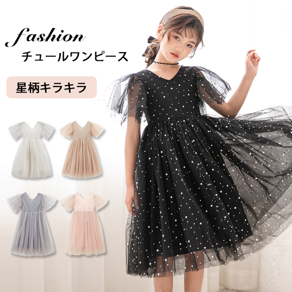 子供 ドレス ピアノ 発表会 キッズ フォーマル チュールワンピース ふわふわ ふんわり感 子供ドレス 半袖 星柄 女の子 ロングワンピース キラキラ フレアワンピース ジュニア 膝丈 プリンセス 結