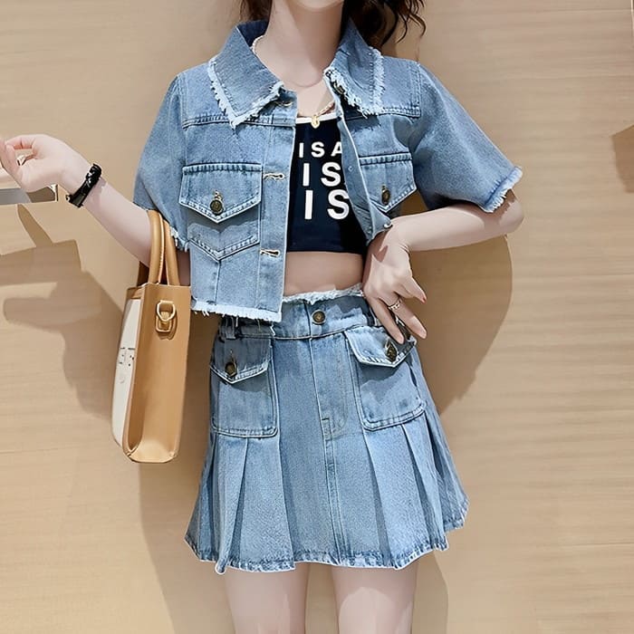 小学生 セットアップ キッズ 女の子 デニムジャケット スカート 2点セット 半袖 春夏 スカートスーツ リラックス 女の子 カジュアル ダンス ガーリー 可愛い 韓国 おしゃれ 16382