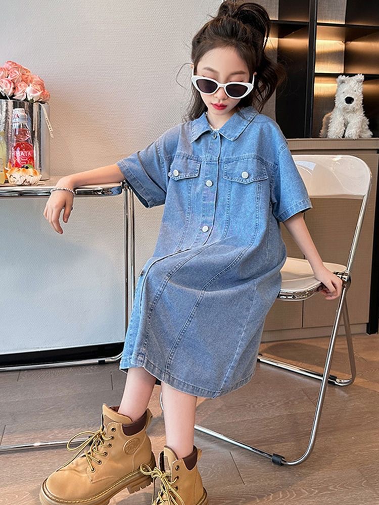 デニムワンピース シャツワンピース 女の子 子供服 半袖 膝丈上 ジュニアキッズ ベビー マタニティ キッズファッション ワンピース