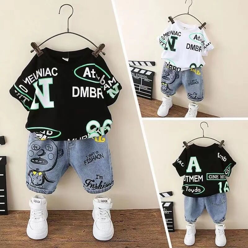 キッズ 子供服 トップス+半パン 2点セット デニムパンツ セットアップ 上下セット 男の子 夏服 夏コーデ 夏 柄デニム プリントデニム プリントtシャツ ゆったり 可愛い ジュニア 半袖 ストリー