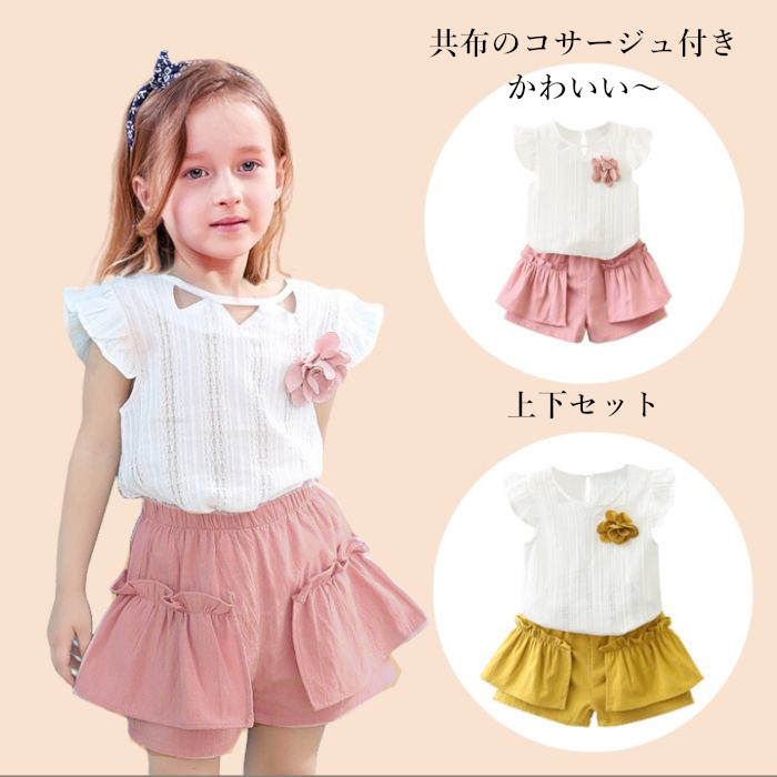お得な夏のセットアップ 単品でも活躍する凝ったデザイン コサージュ付きキッズ ベビー マタニティ キッズファッション トップス シャツ カットソー
