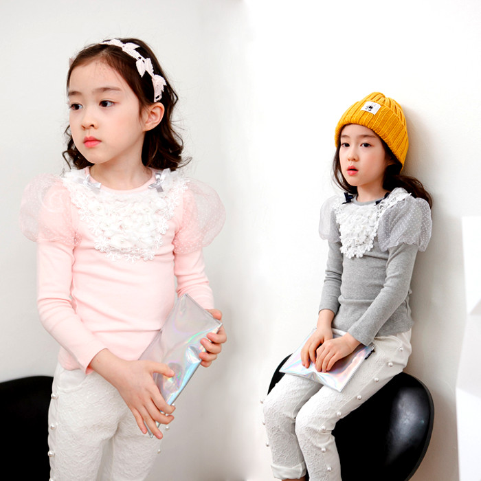 ☆伸縮性のある長袖カットソー☆胸元にあしらったパールやレースシフォンが女の子らしい☆キッズ ベビー マタニティ キッズファッション トップス シャツ カットソー