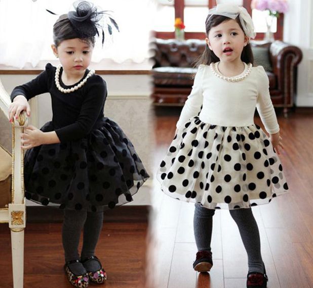 韓国子供服 女の子 ワンピース 春 シンプルなトップス ふんわり水玉もようスカートのワンピース 大きなパールネックレスでパーティーも 可愛い長袖ワンピース