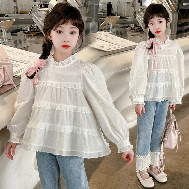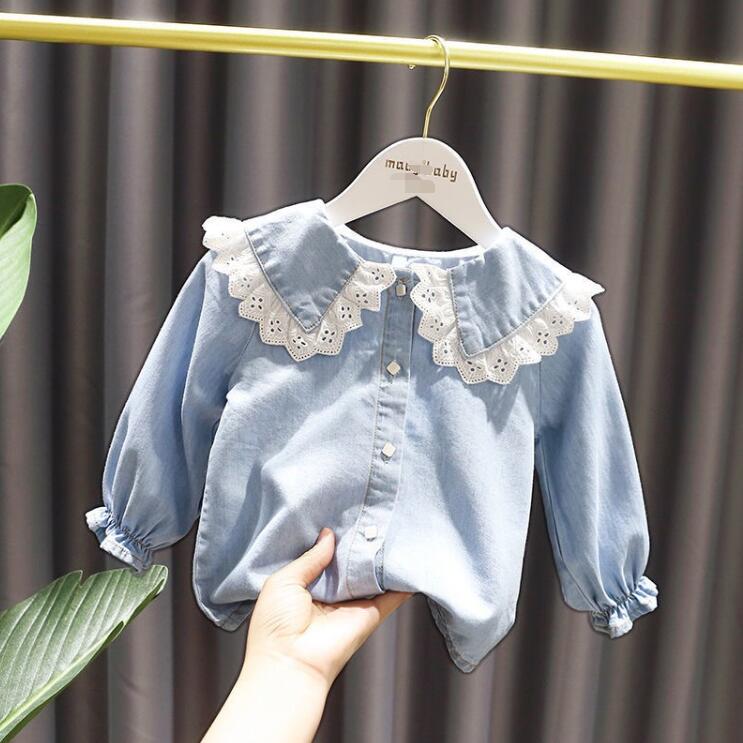 デニム 女の子 レース ブラウス 長袖 トップス 丸襟 可愛い 総レース ブラウス 長袖シャツ フォーマル シャツ 卒園式 発表会 結婚式 通園 通学 制服 園服 面接 合唱
