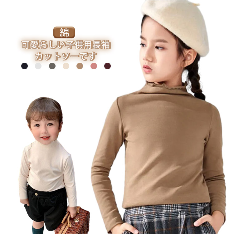 ハイネック ロングTシャツ カットソー 長袖 キッズ トップス シンプル 子供服 女の子 無地 単色 おしゃれ かわいい Tシャツ