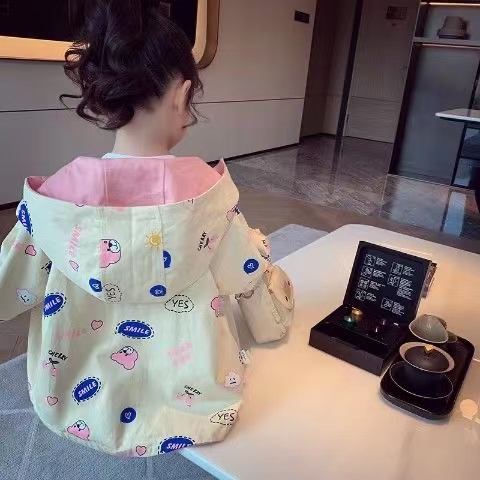 キッズ 子供服 コート アウター トップス カジュアル 女の子 春秋 ゆったり 可愛い フード付き 総柄 薄手 014(2色90-140)