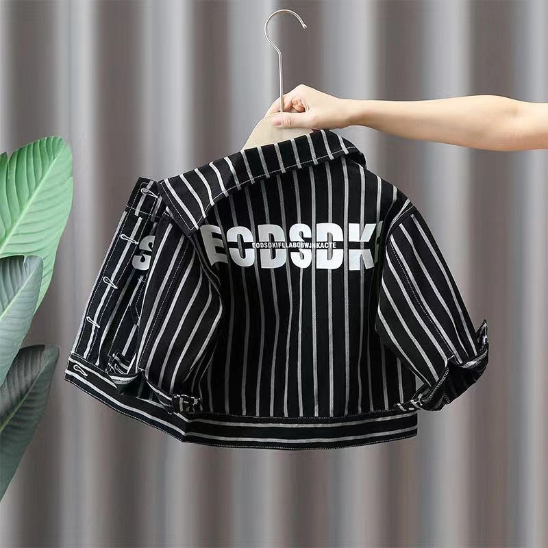 キッズ 子供服 デニムコート ショットコート トップス 男の子 春秋 秋 ゆったり 可愛い 長袖 英文字 薄手 ストライプ柄 011(2色90-150)