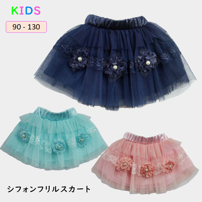 パール入りフラワーモチーフ レース付 可愛いシフォンフリルスカートキッズ ベビー マタニティ キッズファッション スカート