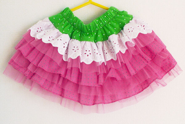 レースフリル付♪ドット柄の超可愛いシフォン重ね4段フリルスカートキッズ ベビー マタニティ キッズファッション スカート
