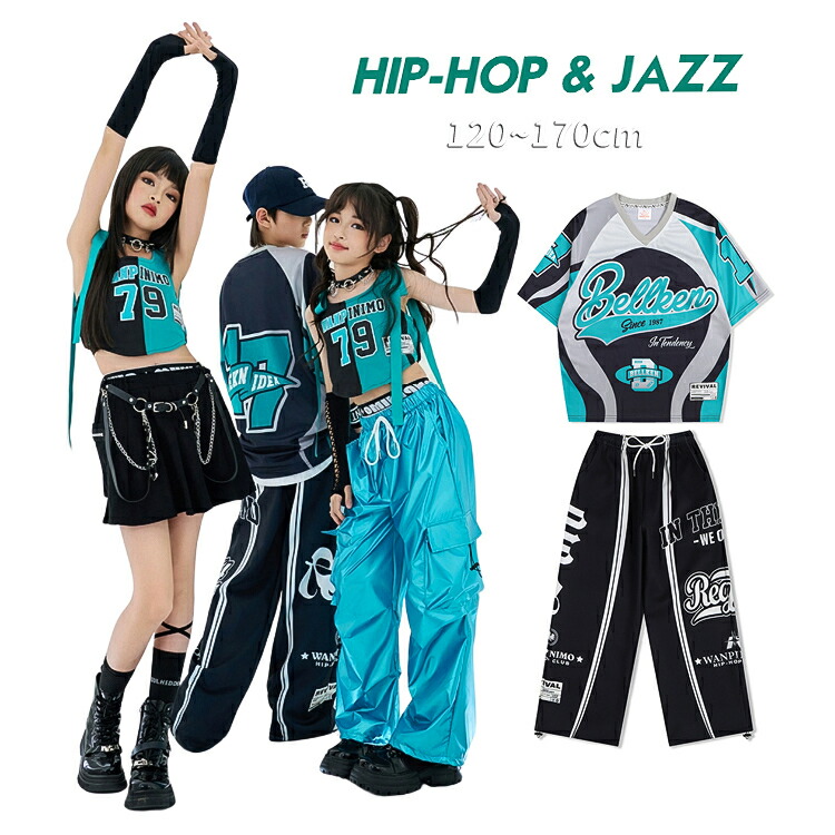 チアダンス ダンス衣装 - 女の子 ステージ 衣装 アイドル衣装 へそ出し キッズダンス衣装 セットアップ スカート 黒 パンツ 青 -2 舞台服 ヒップホップ 衣装 キッズ服 おしゃれ