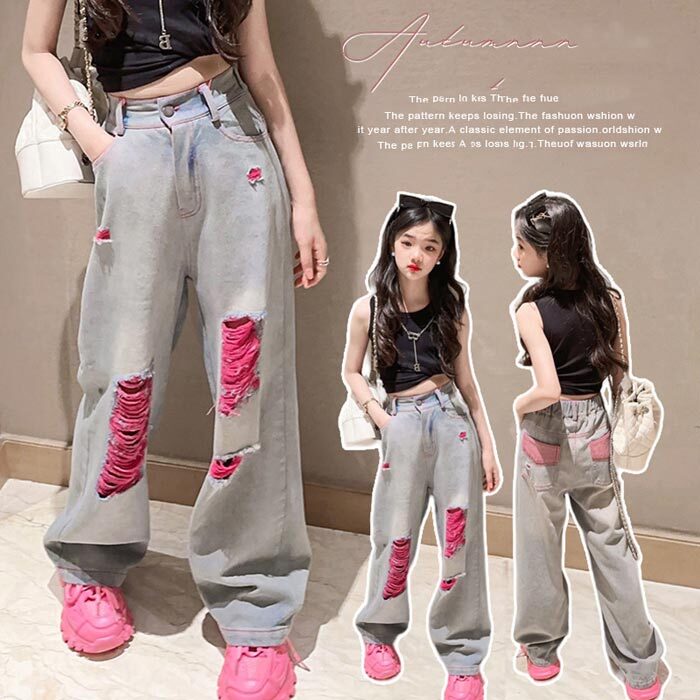 キッズダメージ加工デニムパンツ ズボン ボトムス 女の子パンツ 子供ズボン 韓国服 パンツ カジュアル