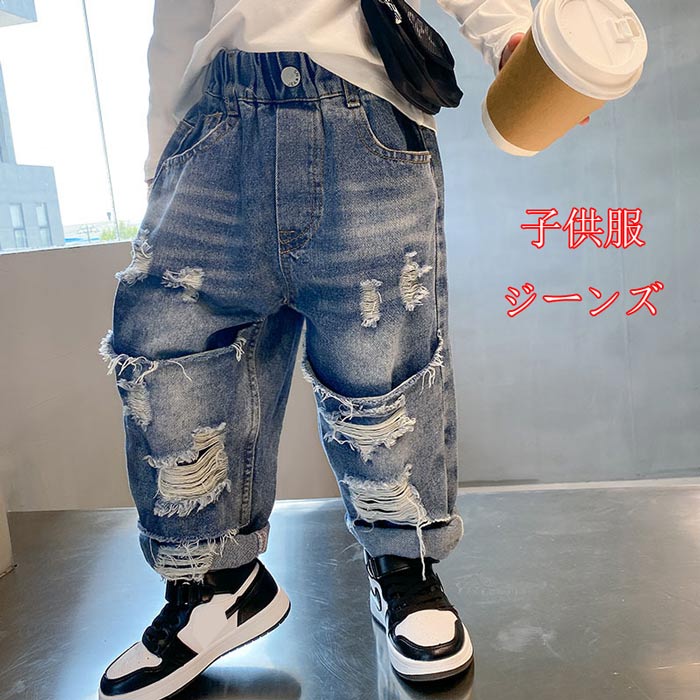男の子 女の子 ダメージ ジーンズ キッズ 子供服 ウエストゴム ダメージ加工 履きやすい ジュニア 子ども用 カジュアル おしゃれ