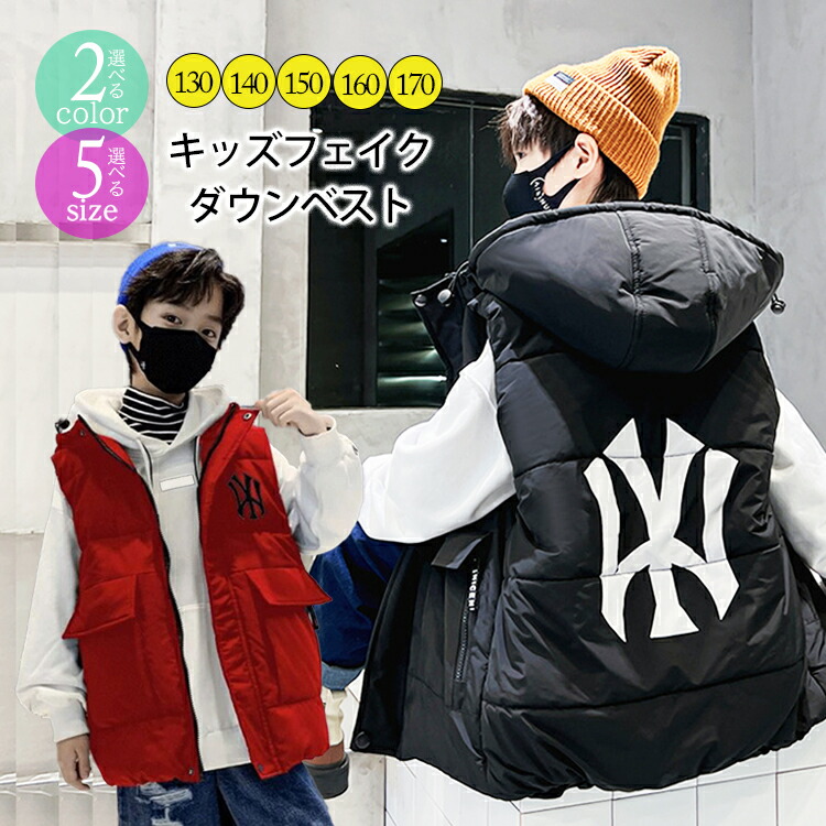 ☆2点目300円クーポン☆ キッズアウター ダウンベスト フェイクダウン 中綿 アウター キッズベスト 秋冬 ノースリーブ 上着 ポケット付き プリントロゴ ファスナー ジップ 暖かい