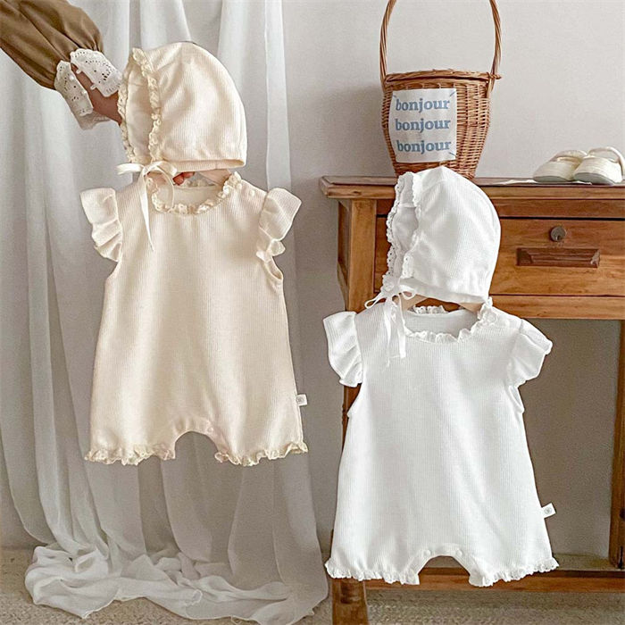 帽付き 2点セットセレモニードレス ベビードレス 退院着 ロンパース 半袖 ワッフルロンパース ベビー 新生児 ボンネット 赤ちゃん 新生児