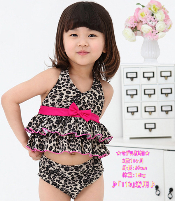 リボン 2段フリル付トップス スイムキャップ付 可愛い豹柄水着2点セットキッズ ベビー マタニティ キッズファッション 水着