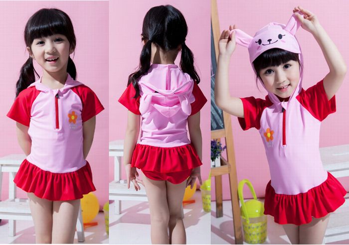 半袖ワンピースタイプに可愛いフードがついたスイムスーツ☆レッド ピンク ブルー イエロー キッズ 水着