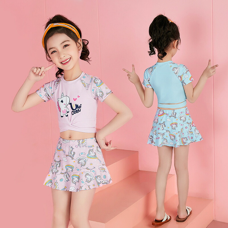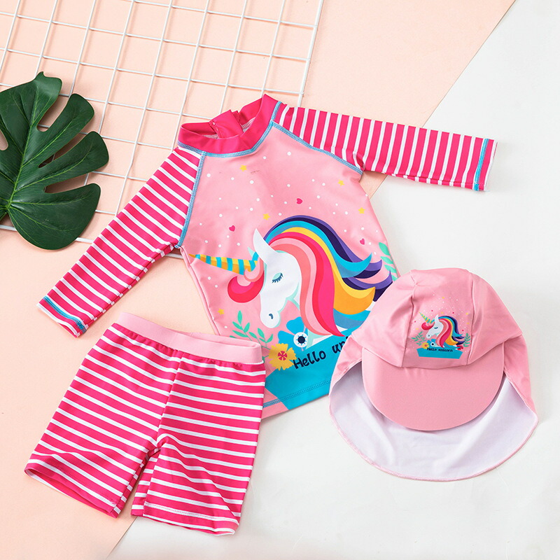 子供水着 女の子 上下セット プール 子供 水着 ショートパンツ 水着 子供 ジュニア水着 スイムウェア ビーチ 水着 キャップ付き ユニコーン柄水着 スイムウェア セパレート ラッシュガード c-y