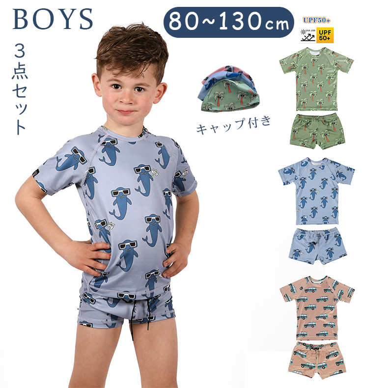 キッズ 水着 男の子 サメ柄水着 上下セット 帽子 3点セット 子ども 子供 動きやすい スイムキャップ 水着 ジュニア 水遊び プール