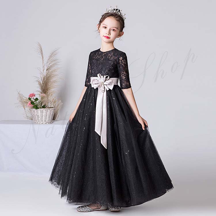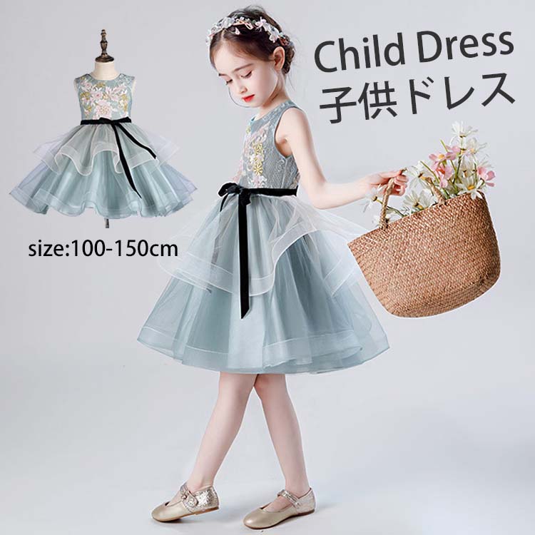 子供 ドレス 発表会 ロング 袖なし ノースリーブ スパンコール花 花柄 刺繍 紗 チュール ワンピース 春夏 黒リボン 飾り 膝丈 淑女 ジュニアドレス 150 司会 演奏会 ドレス