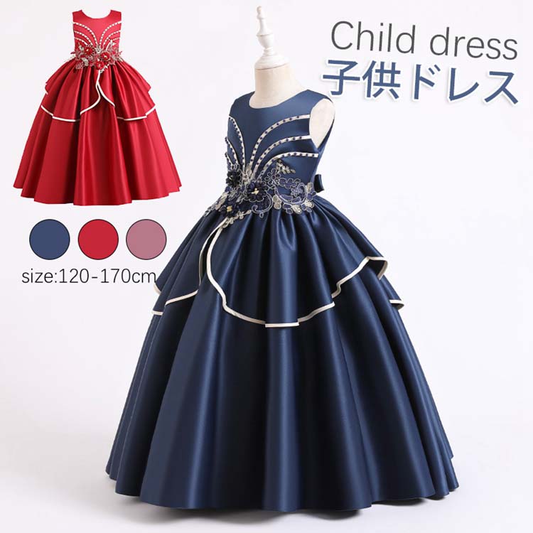 ジュニア コンクール ドレス 子供 ドレス ピアノ 発表会 ワンピース 袖なし ノースリーブ ロング 姫 花柄 刺繍 ウェディングドレス バックファスナー チュールスカート