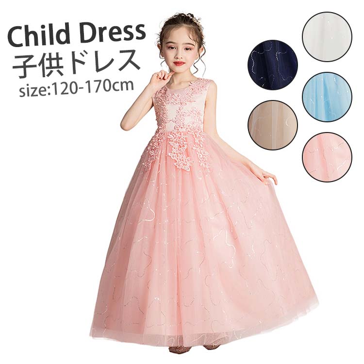 子供 ドレス 発表会 ロング 無地 スパンコール飾り ふわふわ 袖なし ノースリーブ ピンク ワンピース 夏 きれいめ 花ドレス 可愛い かわいい ジュニア ファッション