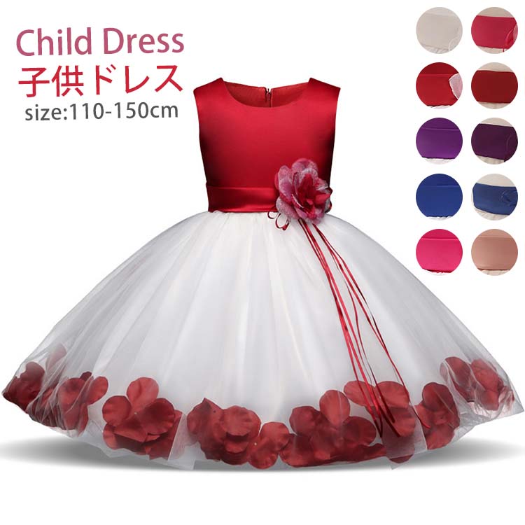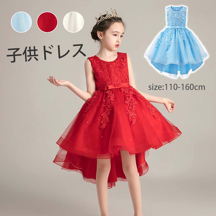 送料无料 ピアノ発表会ドレス 子供ドレス フォーマルドレス 女の子 フラワーガール パーティードレス キッズドレス ブルーローズ レッド 女の子 プリンセスドレス 入学式