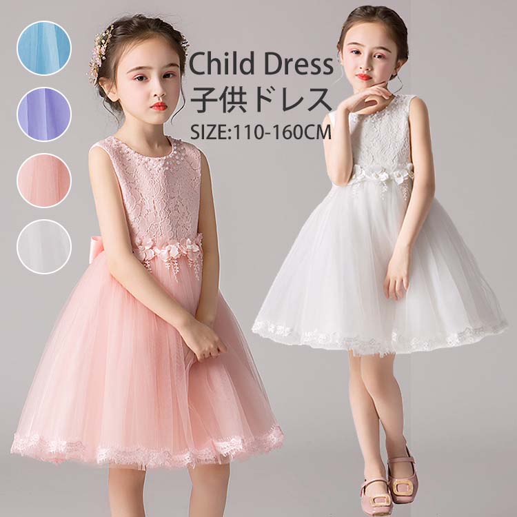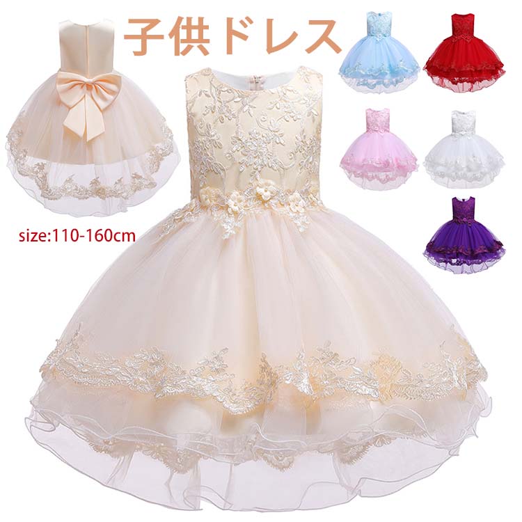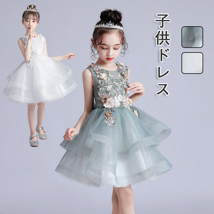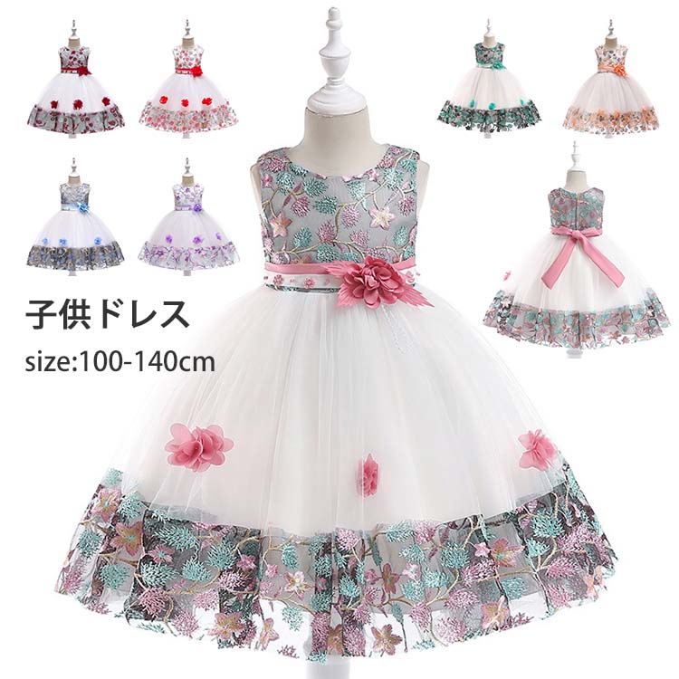 ドレス 子供 ピアノ 発表会 コンクール 刺繍 花柄 スパンコール 袖なし ノースリーブ 後ろリボン 無地 インレギュラー 着地式 チュールスカート キッズ チュール ワンピース