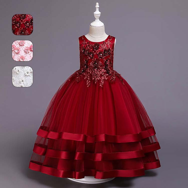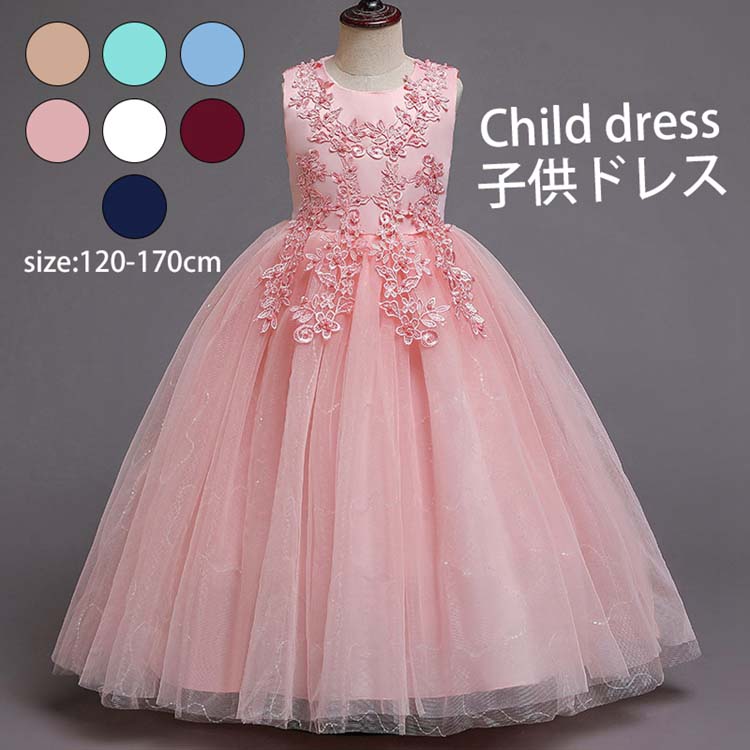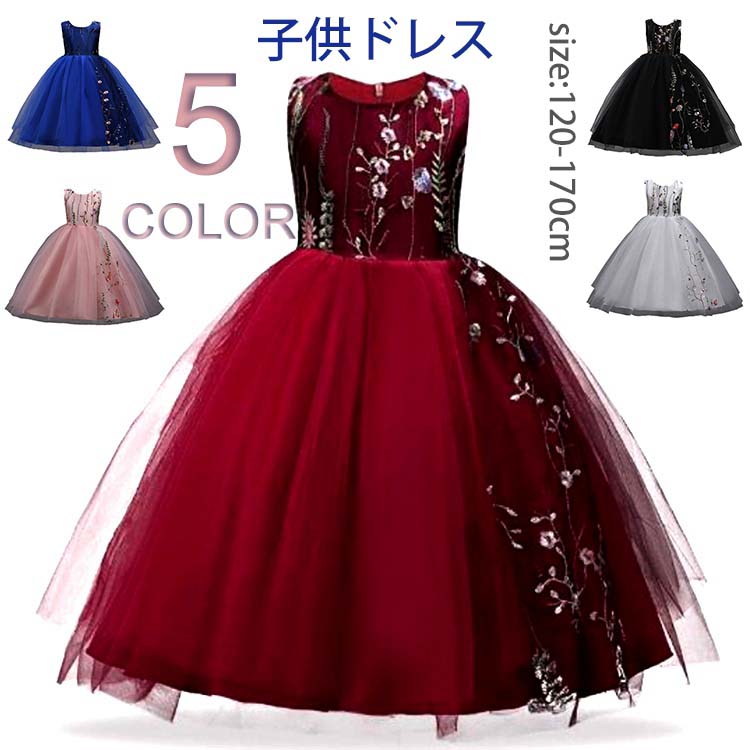 大人 フォーマルドレス ジュニア コンクール ドレス 子供ドレス 発表会 ワンピース 袖なし ロング 姫 プリンセスドレス 花柄 刺繍 後ろ ファスナー リボン チュールスカート