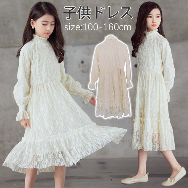 ドレス 子供ドレス ピアノ 発表会 長袖 ワンピース ロング 春夏秋 長袖ドレス 着痩せ 姫 レース 総柄 後ろボタン 立襟 スタンドカラー 私服 普段着 韓国風 ジュニアドレス