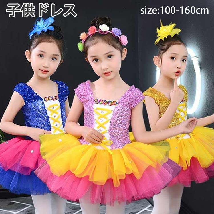 キッズ ダンス衣装 バレェ服 子供ドレス ワンピース 女の子 ノースリーブ カラフル チュールスカート 袖なし チュール ワンピース パフォーマンスドレス 可愛い カラフル
