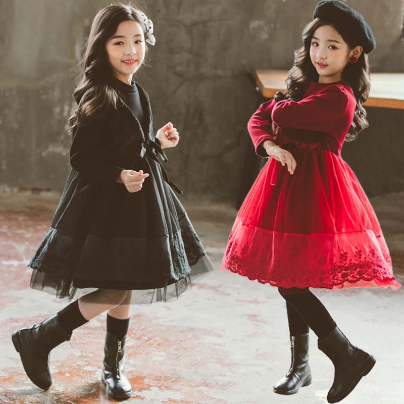 ジュニア コンクール ドレス 子供ドレス 発表会 長袖 ひざ丈 裏ボア ワンピース 膝 春夏秋冬 赤 黒 チュールスカート チュール ワンピース 裏起毛 可愛い オシャレ 結婚式