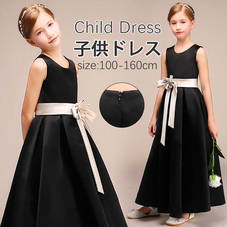 フォーマル ドレス ジュニア コンクール ドレス ワンピース 袖なし 子供ドレス 子供 ドレス ピアノ 発表会 ロング丈 リボン 無地 黒 セレブ セレモニー 演奏会 演出 結婚式