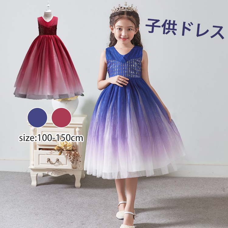ロングドレス 演奏会 ジュニア ピアノ 発表会 大きいサイズ vネック 袖なし ノースリーブ グラデーション スパンコール 飾り 後ろリボン ミモレ丈 ドレス 子供 ピアノ 発表会