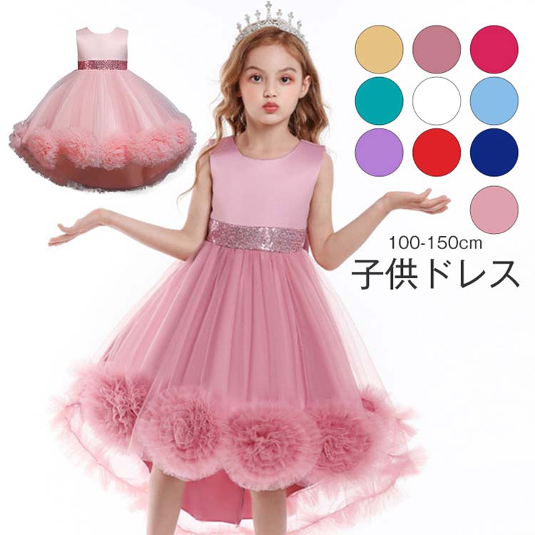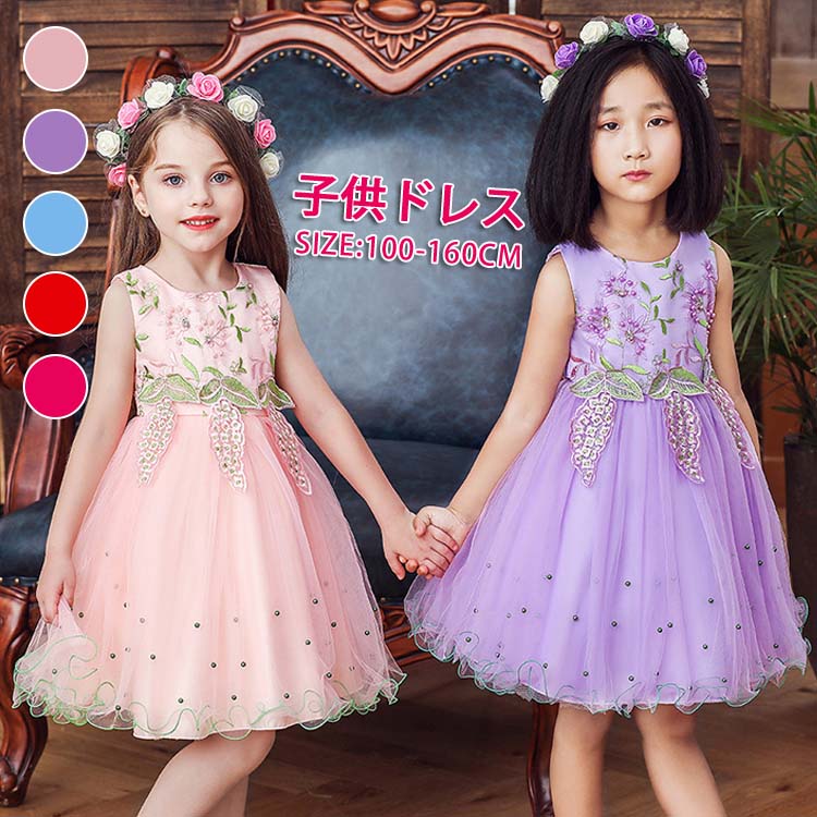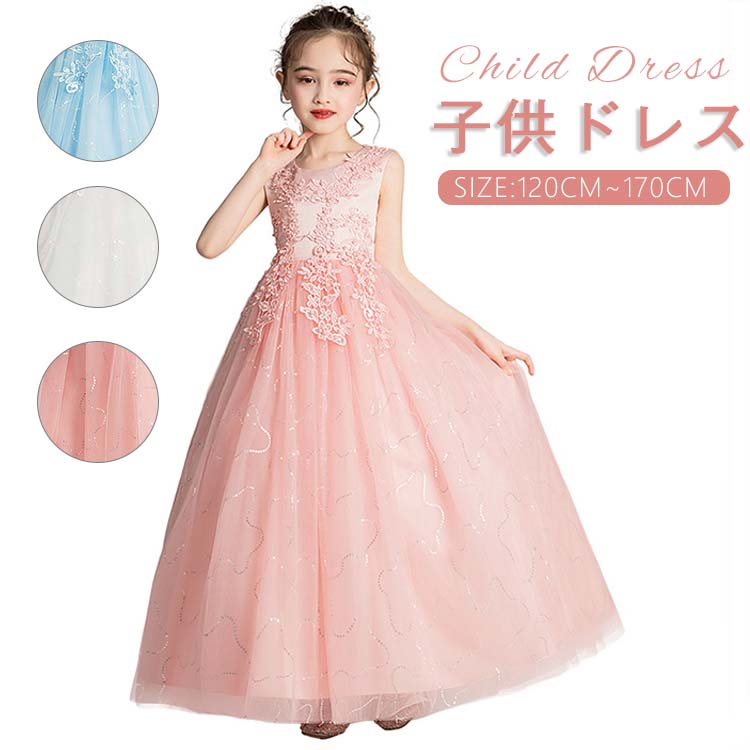 チュールスカート キッズ チュール ワンピース 花柄 刺繍 スパンコール ジュニアドレス 150 160 袖なし ノースリーブ 5色選べる 姫 プリンセス 子供 ドレス 発表会 ロング