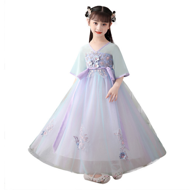 グリーンワンピース 子供服 女の子 唐装漢服 キッズ ドレス舞台演出団体服 中国古代美人服 中華風 七分袖袖あり ロング丈ワンピース ロングワンピース チャイナドレスエレガント 民族風 コスプレウェア