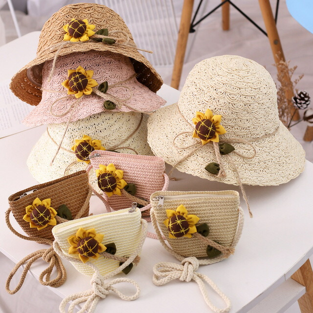 親子 可愛い オシャレ 5色子供 お姫様 プリンセス uvカット 日焼け防止 ビーチハット バケーション 海浜 春 夏 秋ハット 菊麦わら帽子+バッグ 通気 折りたたみ ハット c-maozi-111