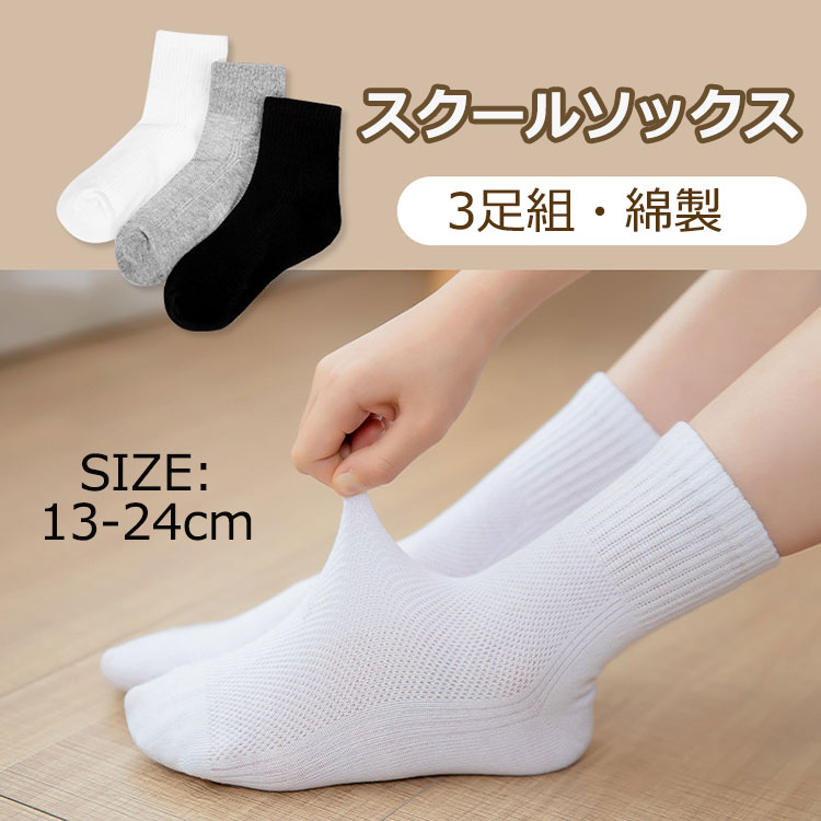 スクール ソックス シンプルベーシックリブ 3足セット 靴下 キッズ 男の子 女の子 消臭 抗菌 黒 白 灰 13-15cm 16-18cm 19-21cm 22-24cm 通園 通学 卒業 卒園 フ