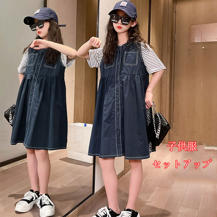 半袖 tシャツ キッズ 2点セット ボーダー柄 Tシャツ +サスペンダースカート 韓国子供服 サロペット 120 130 140 150 160 170cm