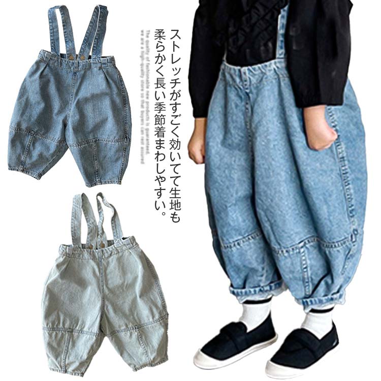 デニムオーバーオール 着やすいサルエルラインデニムオーバーオール ボタンが付いて丈が調節できるデニムオーバーオール100110 120 130 140 150 160